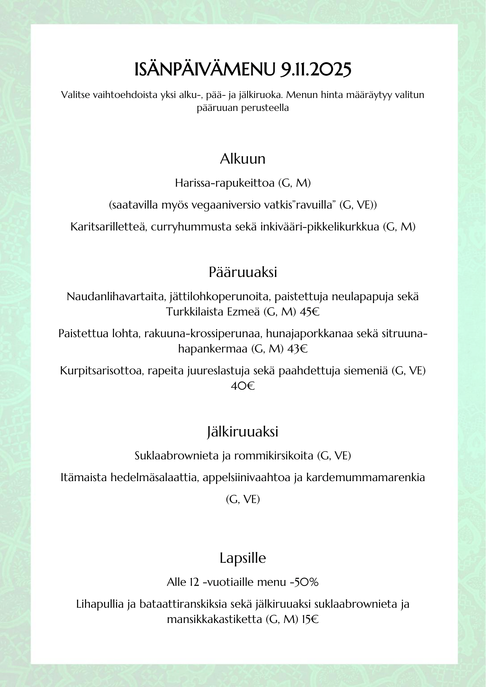 Isänpäivän menullamme voit koota oman kolmen ruokalajin kokonaisuuden valitsemalla mieleisesi alku-, pää- ja jälkiruoan. Hinta määräytyy valitsemasi pääruoan mukaan. Tutustu menuun alla!